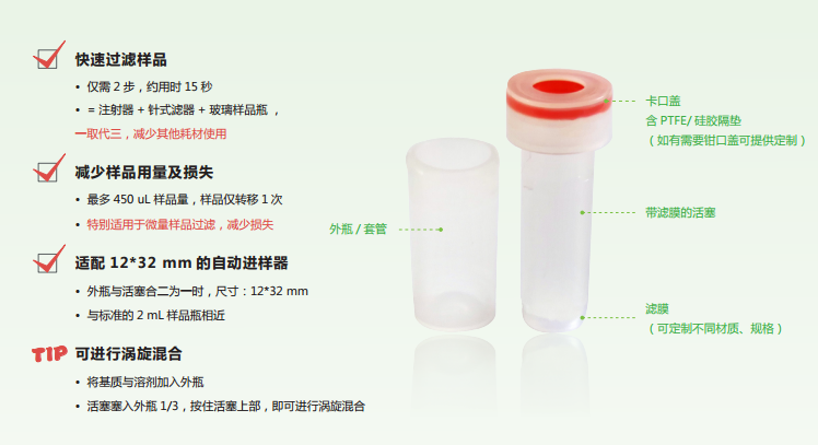 過濾式樣品瓶,450uL,含0.22um親水PTFE膜,預(yù)裝卡口蓋、含透明PTFE/橙色硅橡膠隔墊